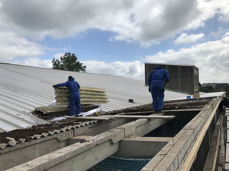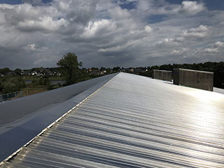 Asbesthaltiges Faserzement demontiert, neues belüftetes Kaltdach montiert, neue KALZIP Eindeckung